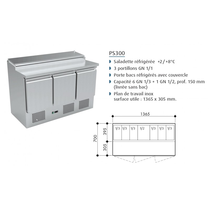 Saladette réfrigérée positive 425 L – 3 portes – Avec groupe logé